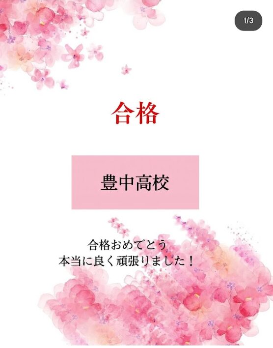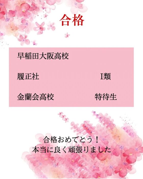 本当におめでとう!でも、これからが勝負で、100%ではないので、しっかり有意義な高校生活を過ごして、勉強も一緒に頑張りましょう(^_^)/