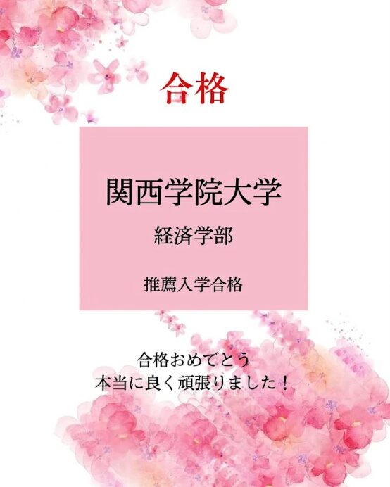関西学院大学の経済学部に、協定校の推薦枠を勝ち取りました。