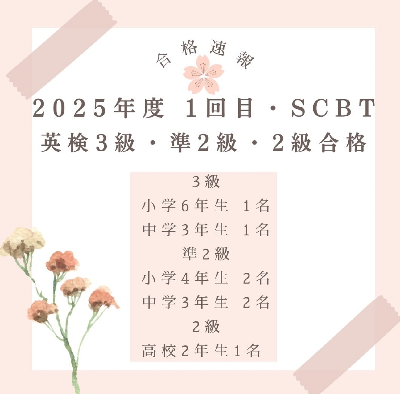 もともと、小学校の頃から良く出来ましたが、2級は文法と大変でした。落ちては凹んで、でもまだまだ中2!最後のSCBTで合格!本当に私達、講師も嬉しかったです。