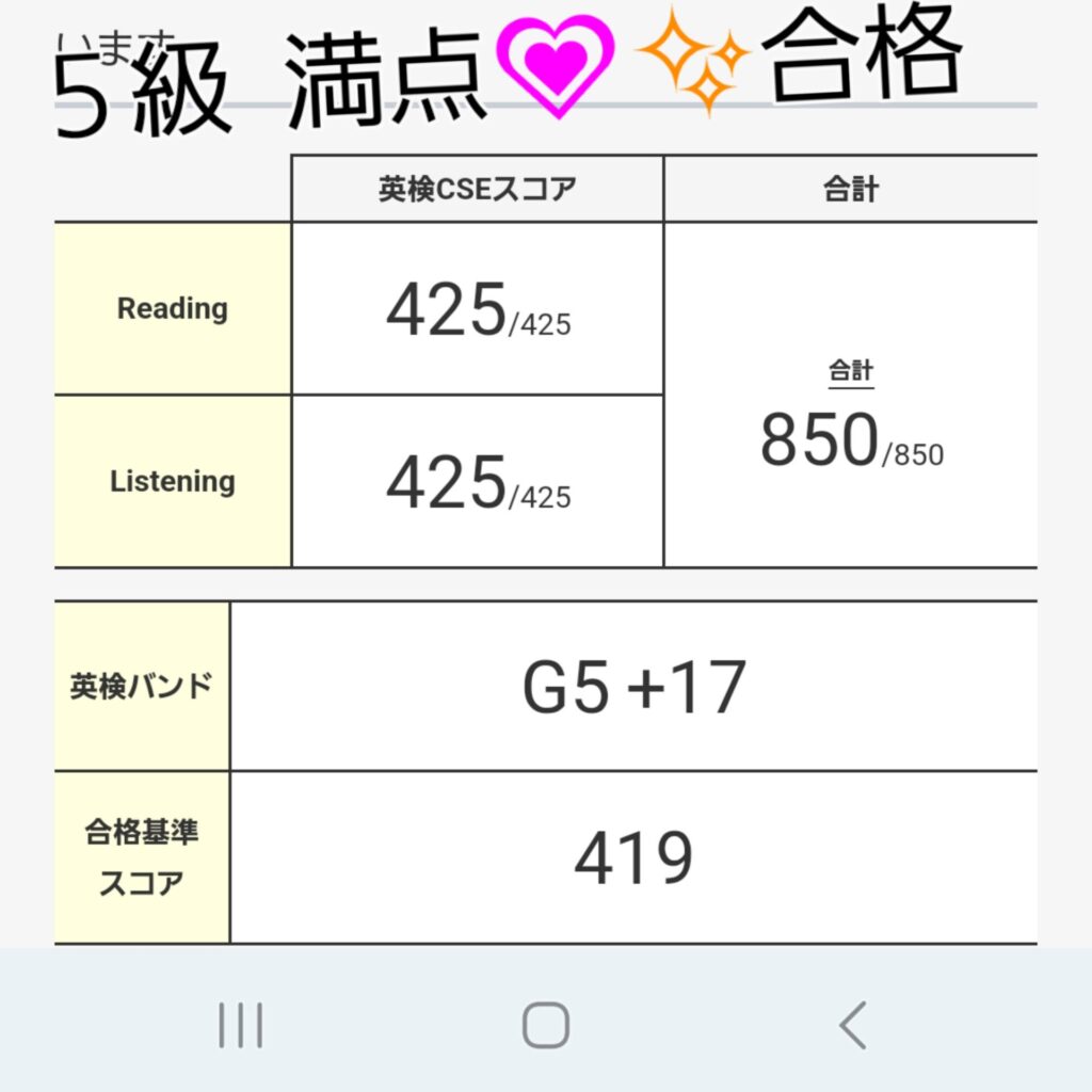 英検5級満点合格(小学4年生 Mちゃん)