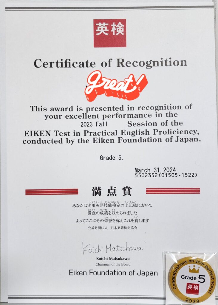 英検5級満点賞届きました(小学生4年生)