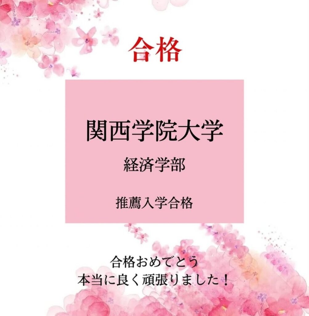 関西学院大学の経済学部に、協定校の推薦枠を勝ち取りました。
